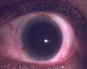 Figure 1. Patient with a deformed iris due to trauma. A soft prosthetic contact lens would be a great option for this patient to reduce their light sensitivity and improve appearance.